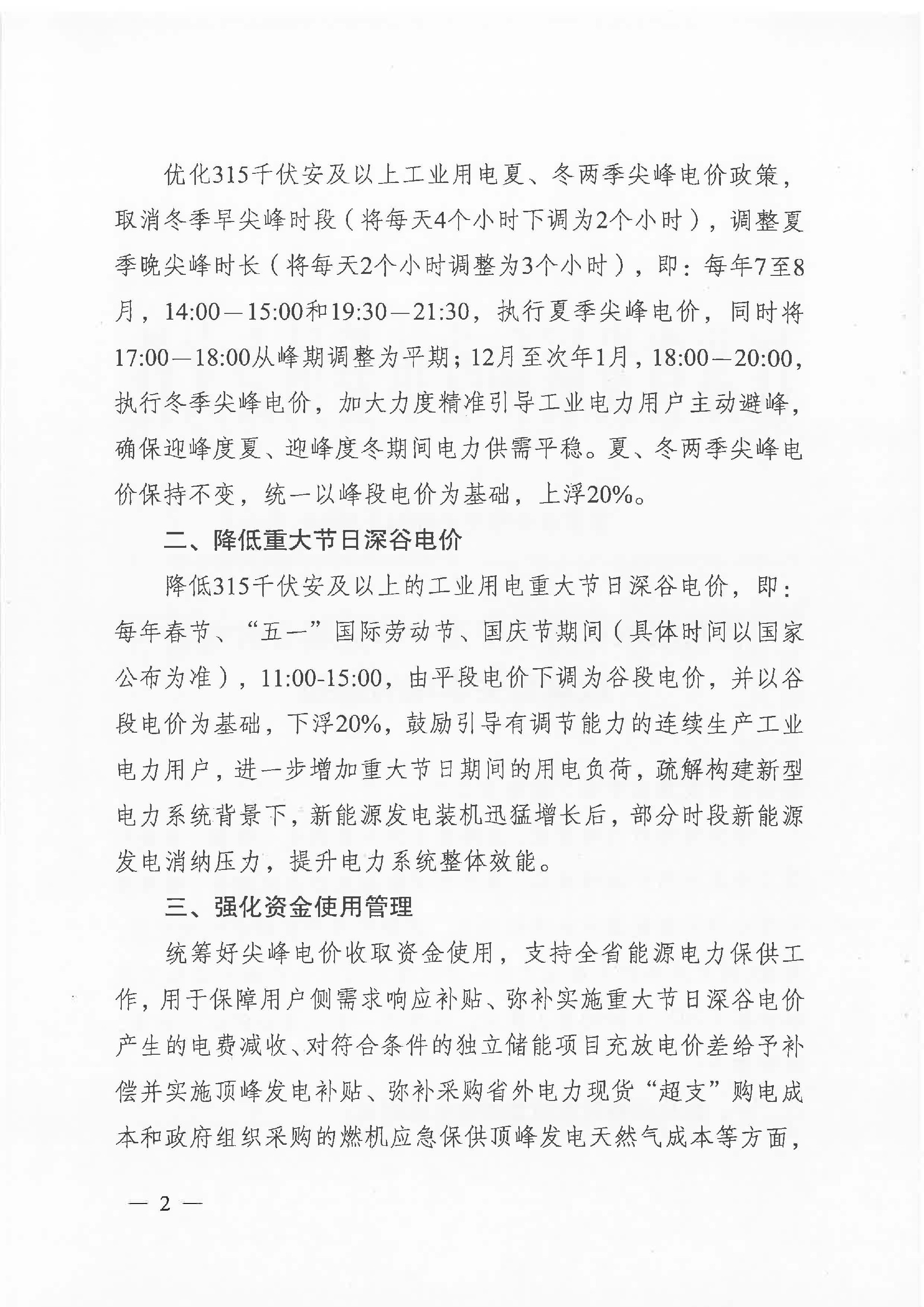 其中提到,优化尖峰时段设置缩短尖峰时长。优化315千伏安及以上工业用电夏、冬两季尖峰电价政策,取消冬季早尖峰时段(将每天4个小时下调为2个小时),调整夏季晚尖峰时长(将每天2个小时调整为3个小时),即:每年7至8月,14:00—15:00和19:30—21:30,执行夏季尖峰电价,同时将17:00—18:00从峰期调整为平期;12月至次年1月,18:00—20:00,执行冬季尖峰电价,加大力度精准引导工业电力用户主动避峰,确保迎峰度夏、迎峰度冬期间电力供需平稳。夏、冬两季尖峰电价保持不变,统一以峰段电价为基础,上浮20%。