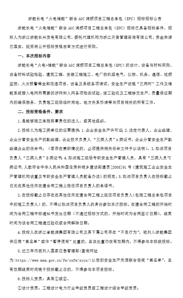 11月18日,浙能长电“火电储能”联合AGC调频项目工程总承包(EPC)招标招标公告发布,项目招标人为浙江浙能长兴发电有限公司,招标内容为浙能长电“火电+储能”联合 AGC 调频项目工程总承包(EPC)的设计、设备与材料采购、设备材料试验检验、建筑工程、安装工程施工、电厂侧机组电气、仪控、机务、通信、视频监控、火灾报警等全部改造项目、设备及系统各项调试、安全生产设施“三同时”工作及储能系统接入电网所需要的涉网和入网各项检测试验、竣工验收及工程移交生产,质量保证期内的维保服务,负责施工现场临时用地、地方关系协调等与项目相关的所有工作。