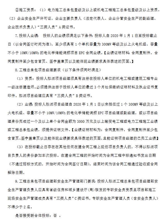 要求投标人自 2020年1月1日至投标截止日(以合同签订时间为准),至少须具有1个单机容量为300MW等级及以上火电机组、容量不小于 10MW/10MWh 的电化学储能调频项目EPC合同业绩。