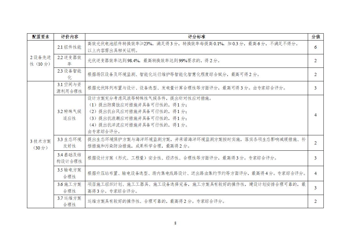 (3)详细评审。通过资格评审申报企业进入详细评审环节,详细评审主要由专家组根据评分标准进行客观评分。按照排名从高至低依次确定我市海上光伏开发场址、规模及投资主体。专家组以书面形式出具专家评审意见,由服务单位将各项目评分结果书面报送市发展改革委。