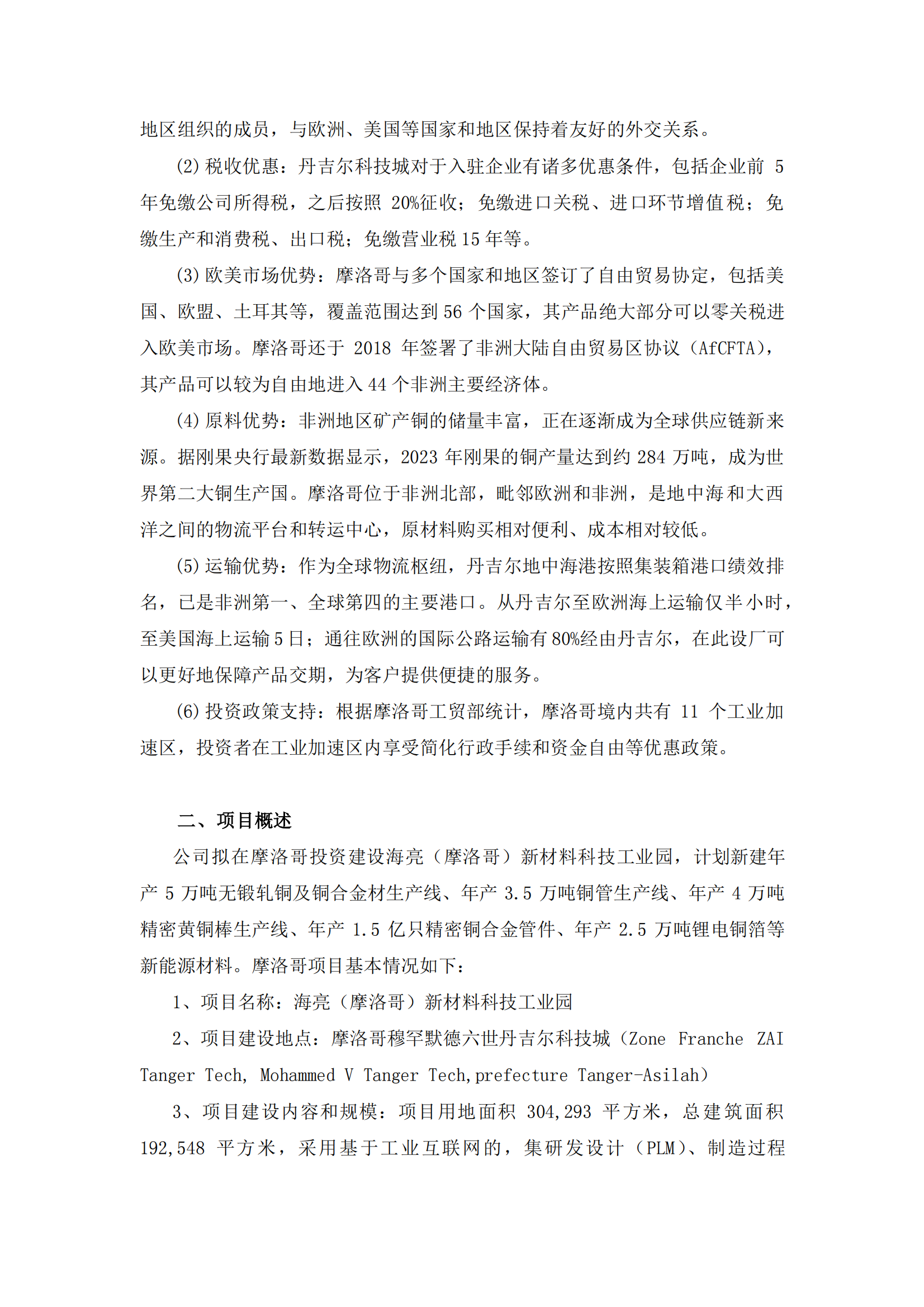 据悉,海亮(摩洛哥)新材料科技工业园项目位于摩洛哥穆罕默德六世丹吉尔科技城(Zone Franche ZAITanger Tech, Mohammed V Tanger Tech,prefecture Tanger-Asilah)。该项目总投资2.88亿美元,资金来源为公司自筹资金。