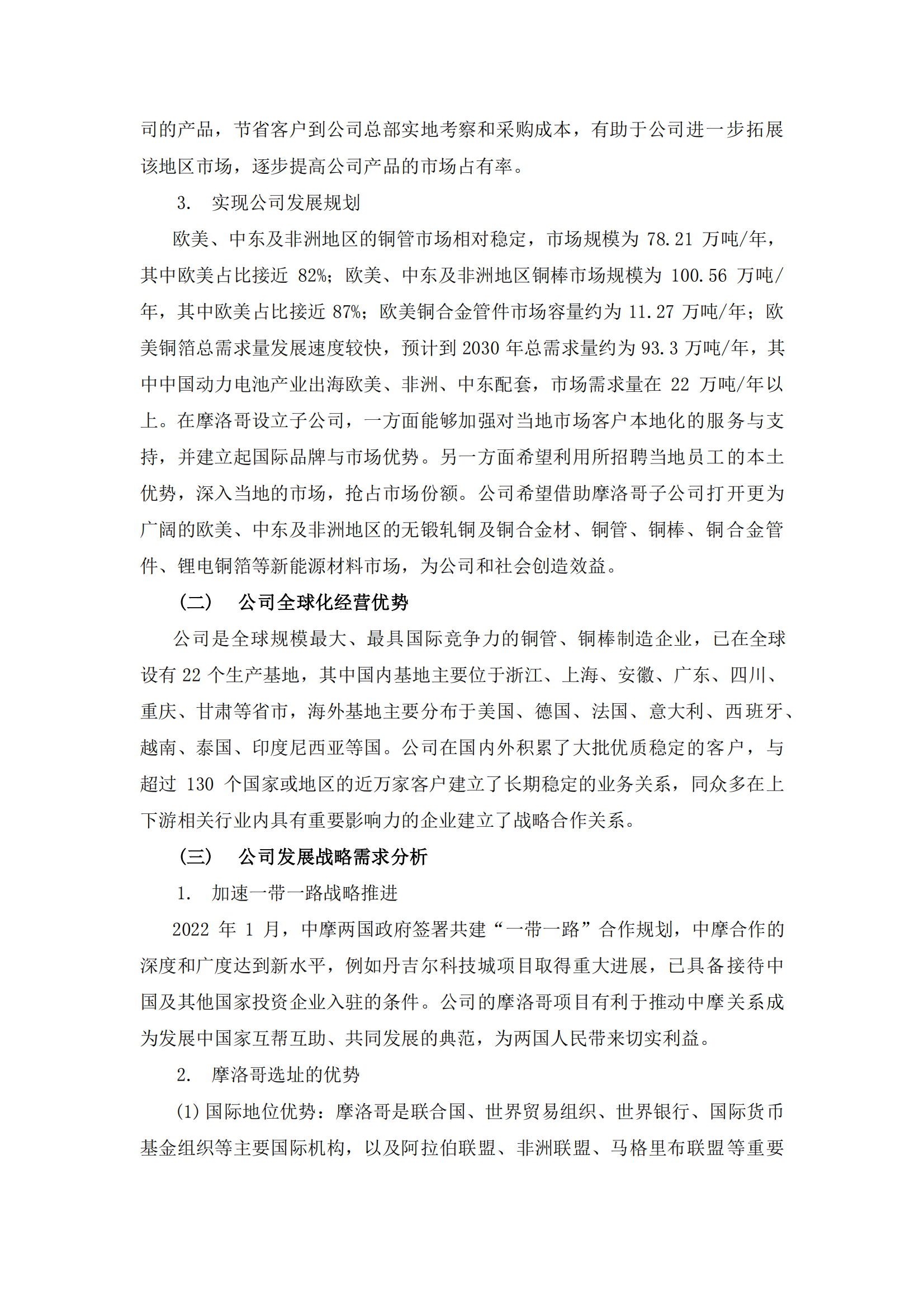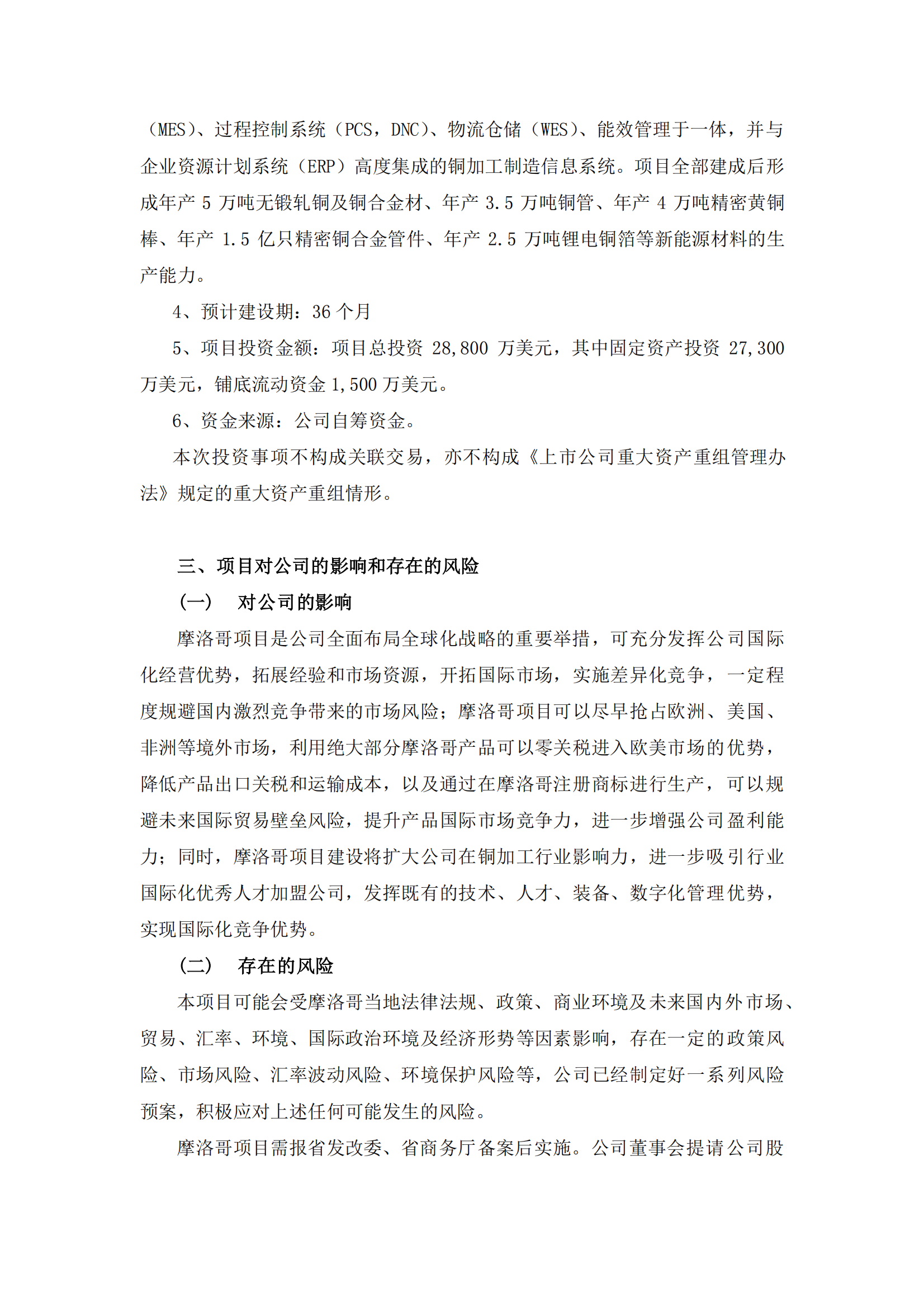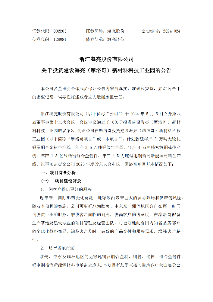 5月8日,浙江海亮股份有限公司发布关于投资建设海亮(摩洛哥)新材料科技工业园的公告。该项目计划新建年产5万吨无锻轧铜及铜合金材生产线、年产3.5万吨铜管生产线、年产4万吨精密黄铜棒生产线、年产1.5亿只精密铜合金管件、年产2.5万吨锂电铜箔等新能源材料生产线。