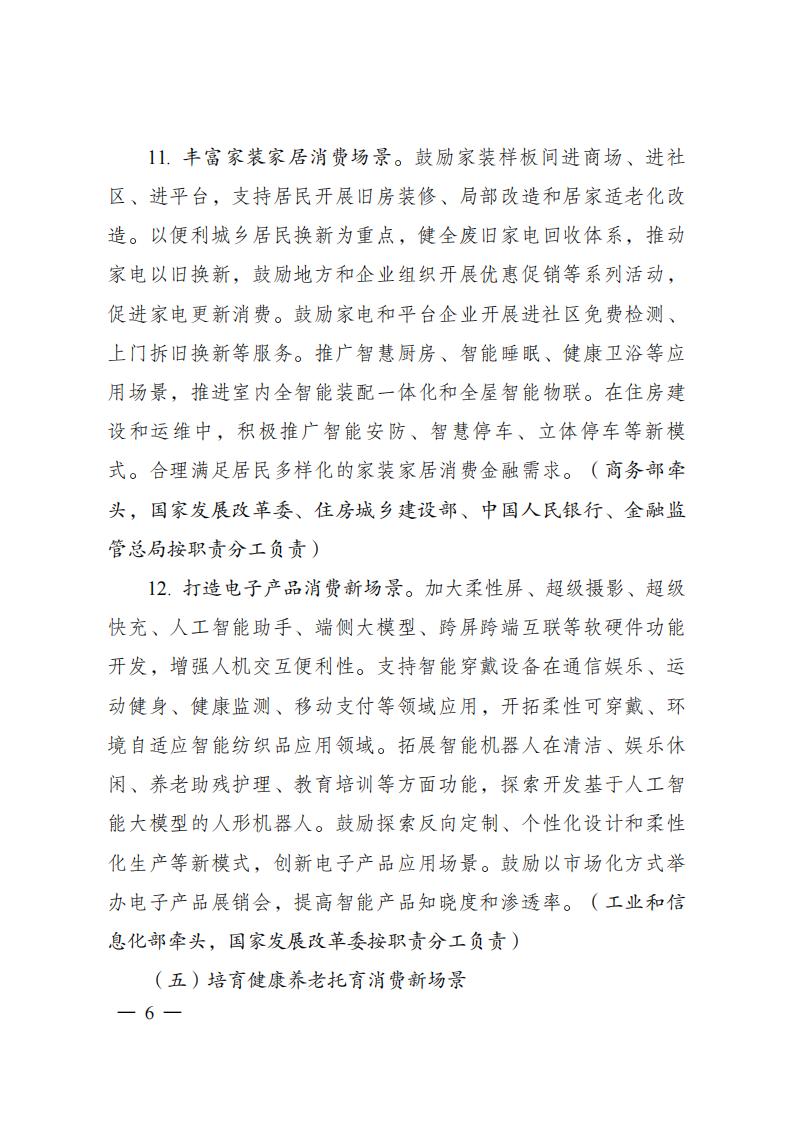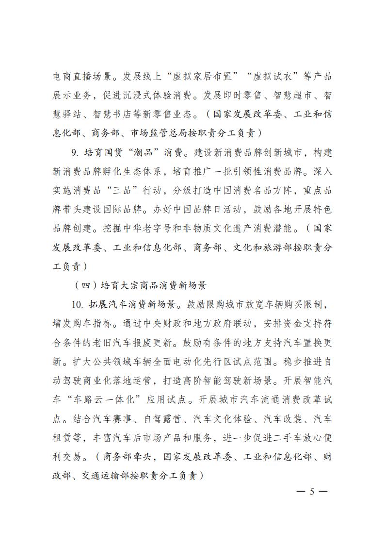 6月24日,国家发展改革委会、农业农村部、商务部、文化和旅游部、市场监管总局印发《关于打造消费新场景培育消费新增长点的措施》的通知。提出拓展汽车消费新场景。鼓励限购城市放宽车辆购买限制,增发购车指标。通过中央财政和地方政府联动,安排资金支持符合条件的老旧汽车报废更新。鼓励有条件的地方支持汽车置换更新。扩大公共领域车辆全面电动化先行区试点范围。稳步推进自动驾驶商业化落地运营,打造高阶智能驾驶新场景。开展智能汽车“车路云一体化”应用试点。开展城市汽车流通消费改革试点。结合汽车赛事、自驾露营、汽车文化体验、汽车改装、汽车租赁等,丰富汽车后市场产品和服务,进一步促进二手车放心便利交易。优化农村社区消费环境,支持新能源汽车、绿色智能家电等下乡。