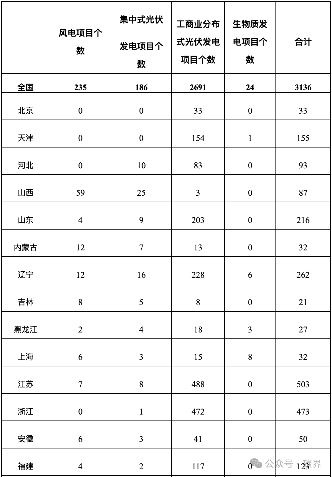 2024年6月,全国新增建档立卡新能源发电(不含户用光伏)项目共3136个,其中风电项目235个,光伏发电项目2877个(集中式光伏发电项目186个,工商业分布式光伏发电项目2691个),生物质发电项目24个。