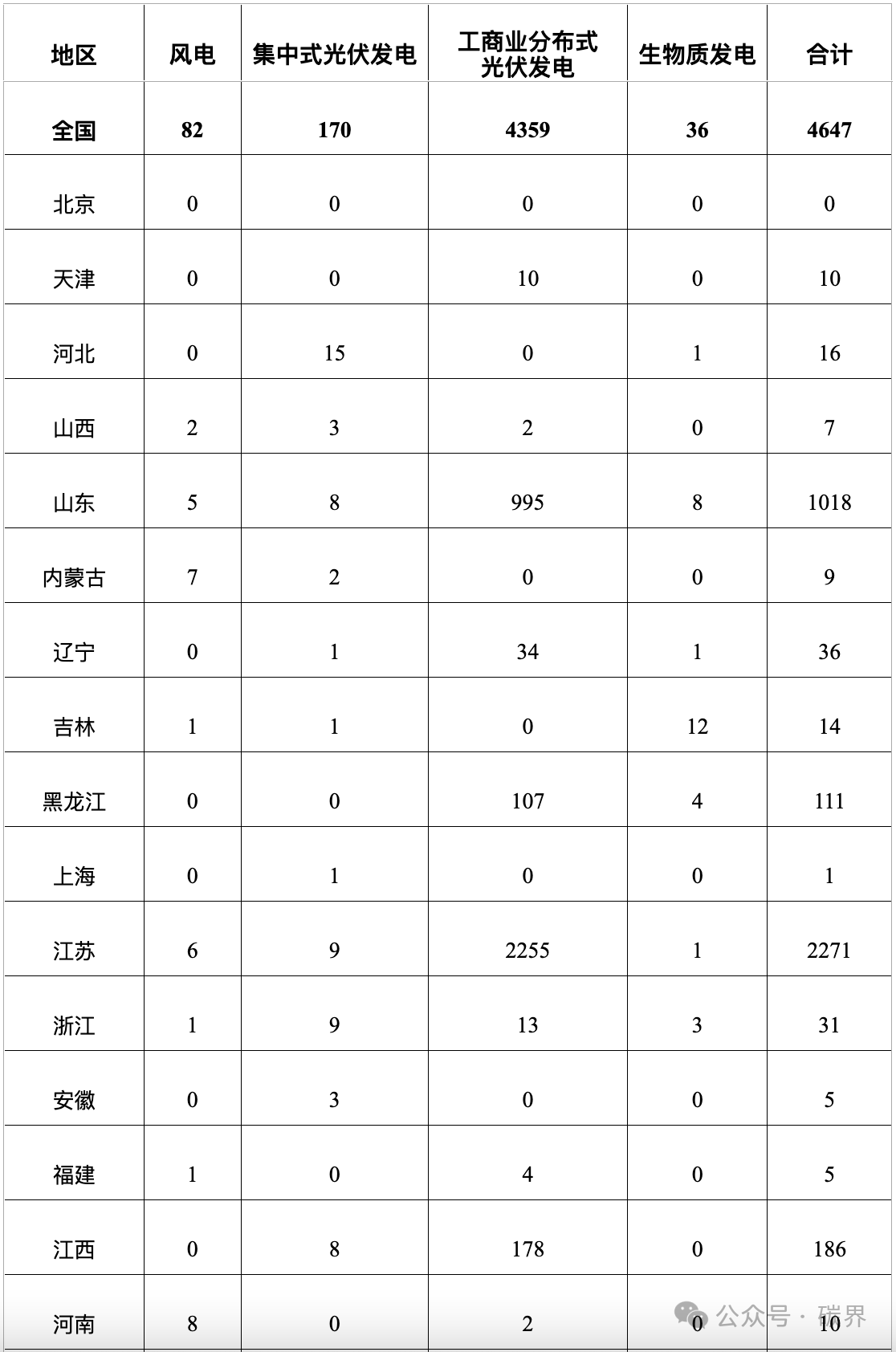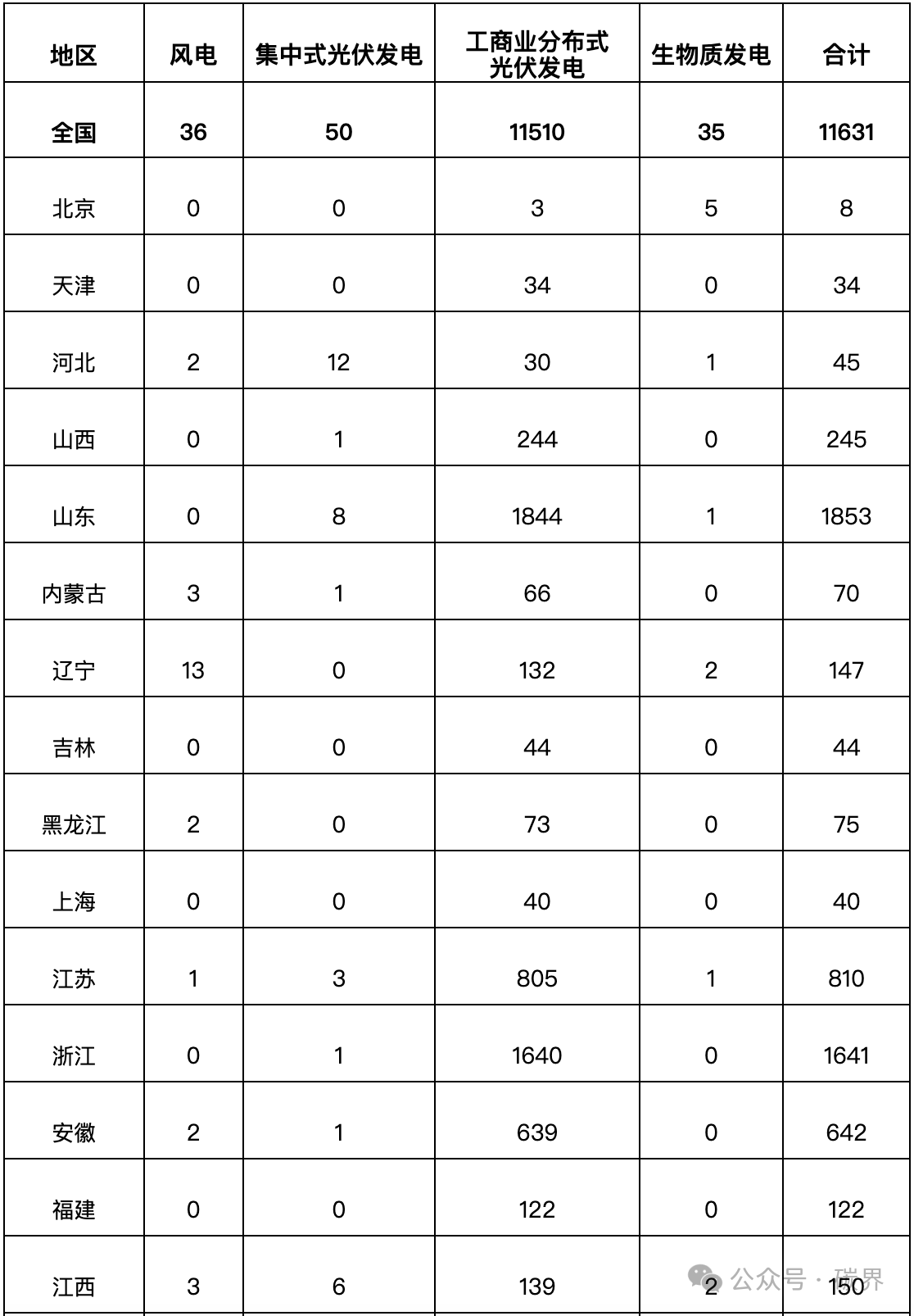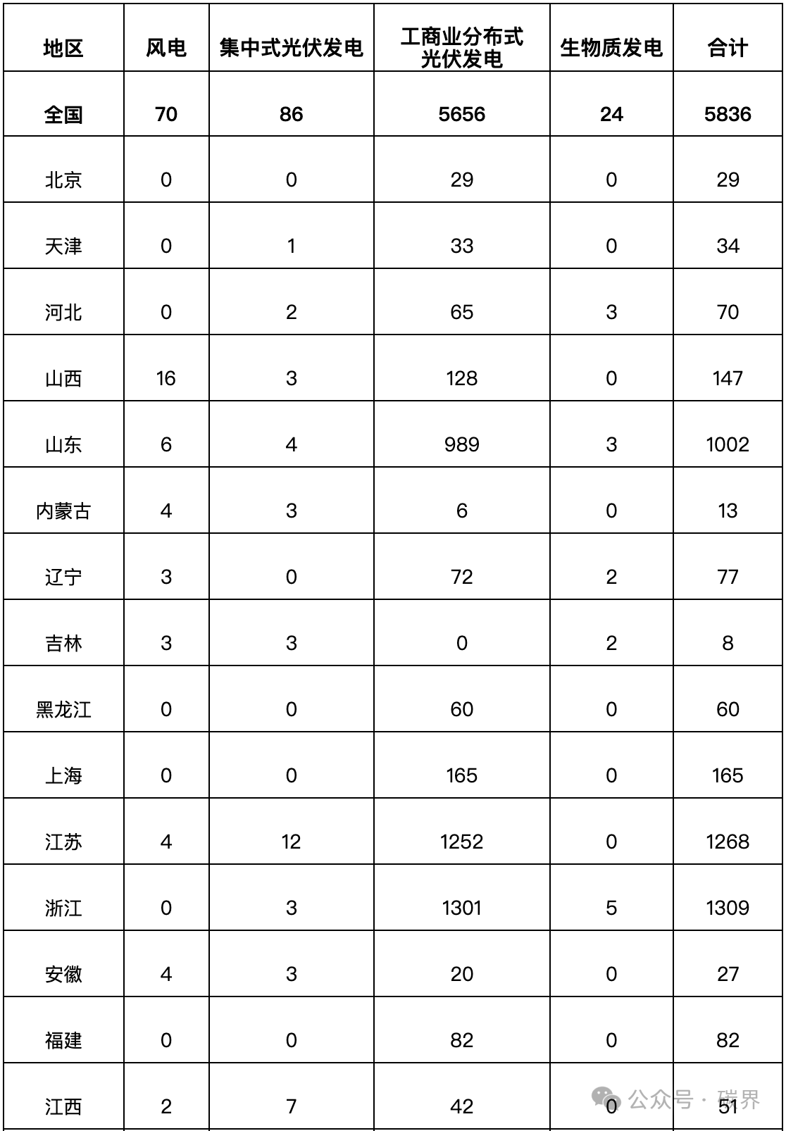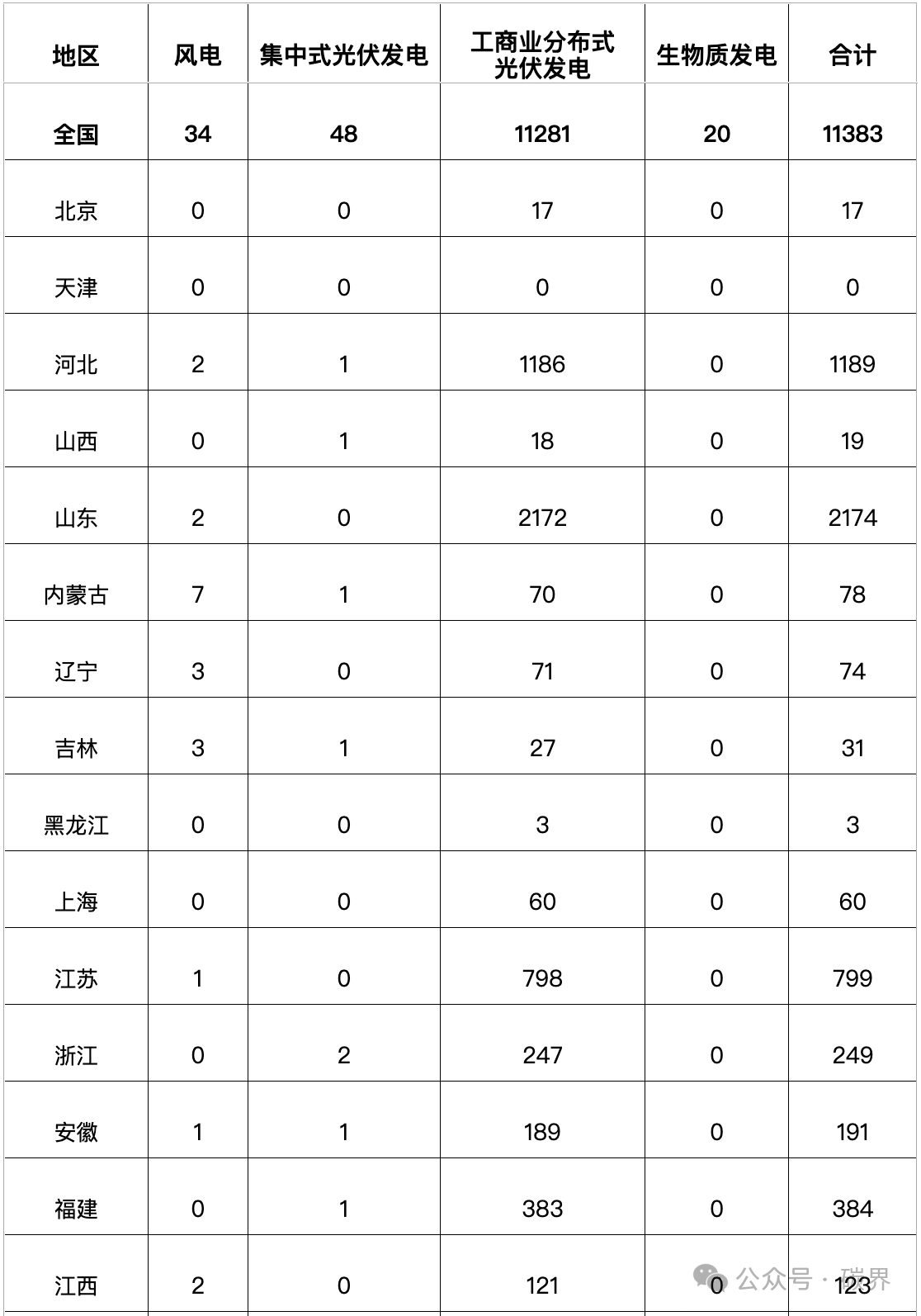 碳界根据国家能源局的数据统计,2024年5月至10月,全国新能源发电新增建档立卡项目共37396个(其中6-9月数据不含户用光伏,10月数据不含自然人户用光伏),其中光伏36746个(其中,6-10月集中式光伏发电项目540个,工商业分布式光伏发电项目35497个),风电502个,生物质发电项目148个。