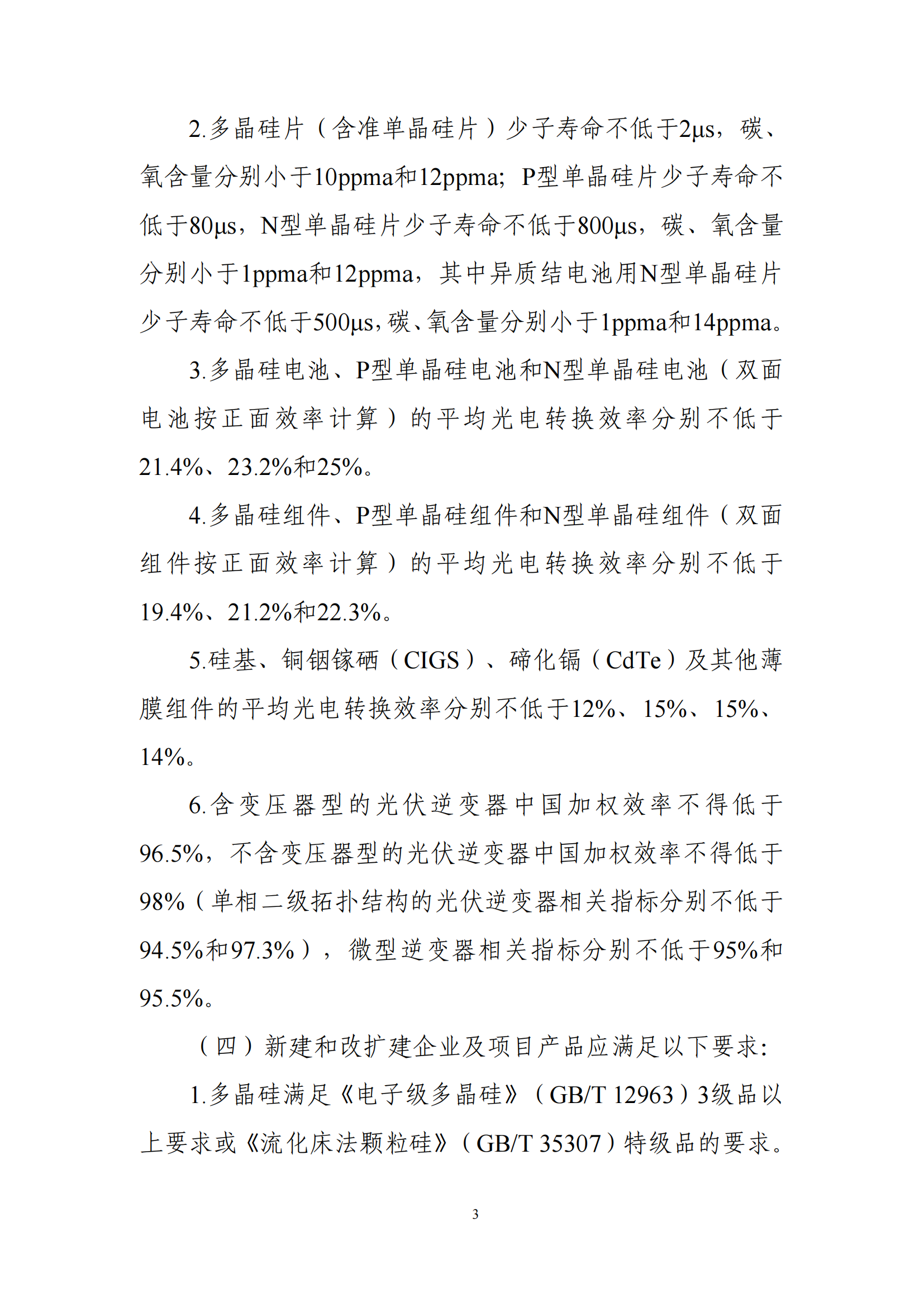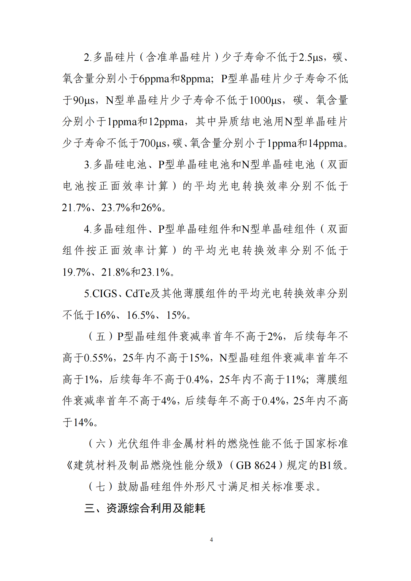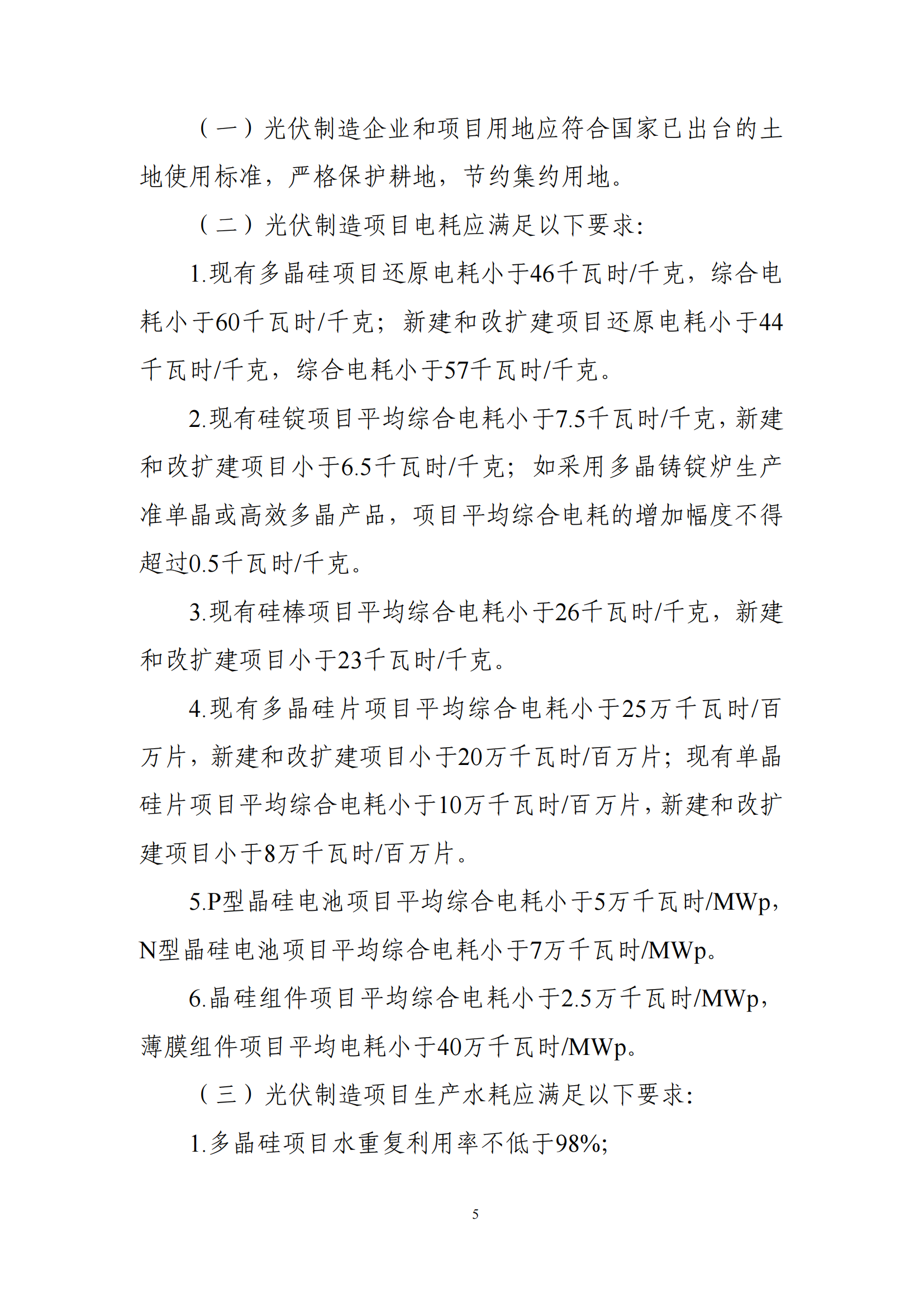 光伏制造项目电耗应满足以下要求:现有多晶硅项目还原电耗小于46千瓦时/千克,综合电耗小于60千瓦时/千克;新建和改扩建项目还原电耗小于44千瓦时/千克,综合电耗小于57千瓦时/千克。现有硅锭项目平均综合电耗小于7.5千瓦时/千克,新建和改扩建项目小于6.5千瓦时/千克;如采用多晶铸锭炉生产准单晶或高效多晶产品,项目平均综合电耗的增加幅度不得超过0.5千瓦时/千克。现有硅棒项目平均综合电耗小于26千瓦时/千克,新建和改扩建项目小于23千瓦时/千克。现有多晶硅片项目平均综合电耗小于25万千瓦时/百万片,新建和改扩建项目小于20万千瓦时/百万片;现有单晶硅片项目平均综合电耗小于10万千瓦时/百万片,新建和改扩建项目小于8万千瓦时/百万片。P型晶硅电池项目平均综合电耗小于5万千瓦时/MWp,N型晶硅电池项目平均综合电耗小于7万千瓦时/MWp。晶硅组件项目平均综合电耗小于2.5万千瓦时/MWp,薄膜组件项目平均电耗小于40万千瓦时/MWp。