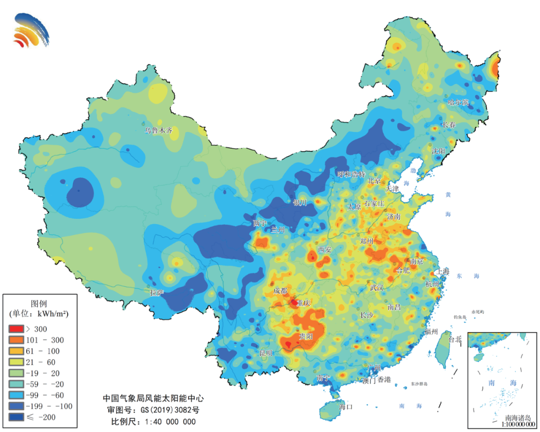 3. 水平面总辐照量西部和华南较常年偏小,中东部大部较常年偏大
