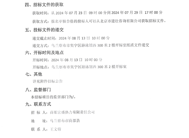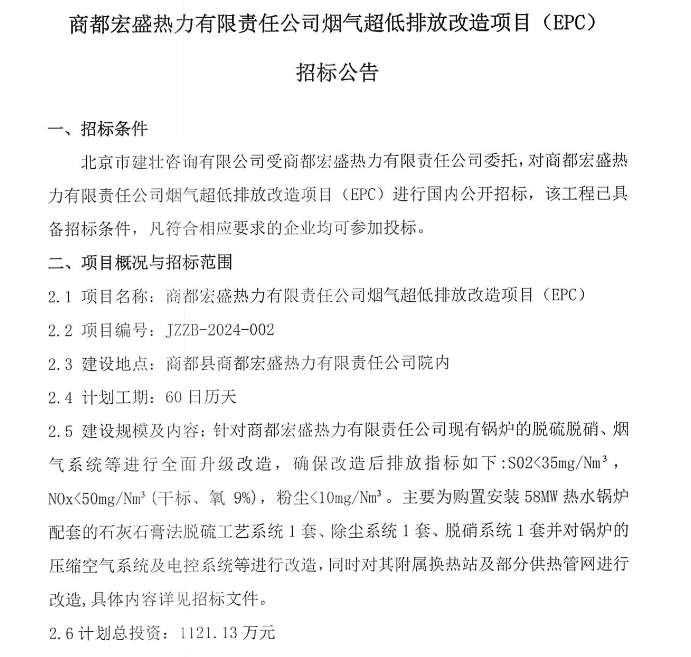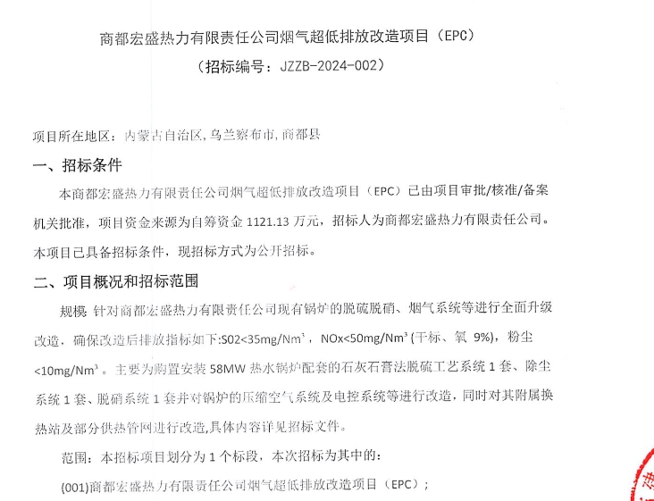 7月22日,商都宏盛热力有限责任公司烟气超低排放改造项目(EPC)招标公告发布。公告显示,针对商都宏盛热力有限责任公司现有锅炉的脱硫脱硝、烟气系统等进行全面升级改造,确保改造后排放指标如下:SO2<35mg/Nm3,NOx<50mg/Nm3(千标、氧 9%),粉尘<10mg/Nm3。主要为购置安装58MW 热水锅炉配套的石灰石膏法脱硫工艺系统1套、除尘系统1套、脱硝系统1套并对锅炉的压缩空气系统及电控系统等进行改造,同时对其附属换热站及部分供热管网进行改造。