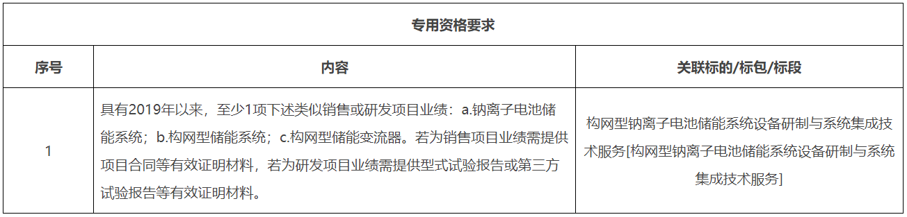 招标要求,投标人2019年以来具有至少1项钠离子电池储能系统、构网型储能系统、构网型储能变流器的类似销售或研发项目业绩。