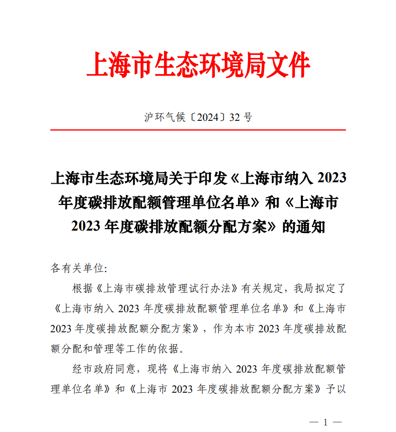 近日,上海市生态环境局印发《上海市纳入2023年度碳排放配额管理单位名单》和《上海市2023年度碳排放配额分配方案》的通知。