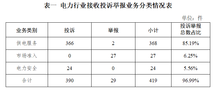 电力行业排在首位,数量为419件、占投诉举报总数的96.99%,主要集中在供电服务、市场准入、电力安全等方面。