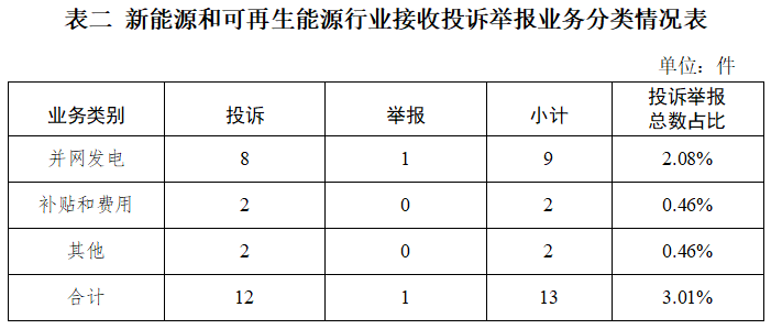 新能源和可再生能源行业排在第二位,数量为13件、占投诉举报总数的3.01%,主要集中在并网发电、补贴和费用等方面。