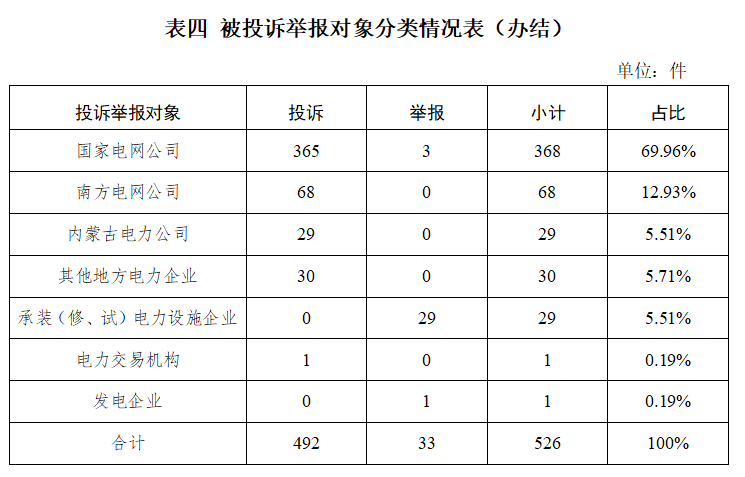 从被投诉举报对象看,供电企业495件、占投诉举报总数的94.10%,其中国家电网公司368件,占比69.96%;南方电网公司68件,占比12.93%;内蒙古电力公司29件,占比5.51%;其他地方电力企业30件,占比5.71%;承装(修、试)电力设施企业29件,占比5.51%;发电企业1件,占比0.19%;电力交易机构1件,占比0.19%。