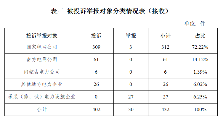 供电企业402件、占投诉举报总数的93.75%,其中国家电网公司312件、占投诉举报总数的72.22%,南方电网公司61件、占投诉举报总数的14.12%,内蒙古电力公司6件、占投诉举报总数的1.39%,其他地方电力企业26件、占投诉举报总数的6.02%;承装(修、试)电力设施企业27件、占投诉举报总数的6.25%。