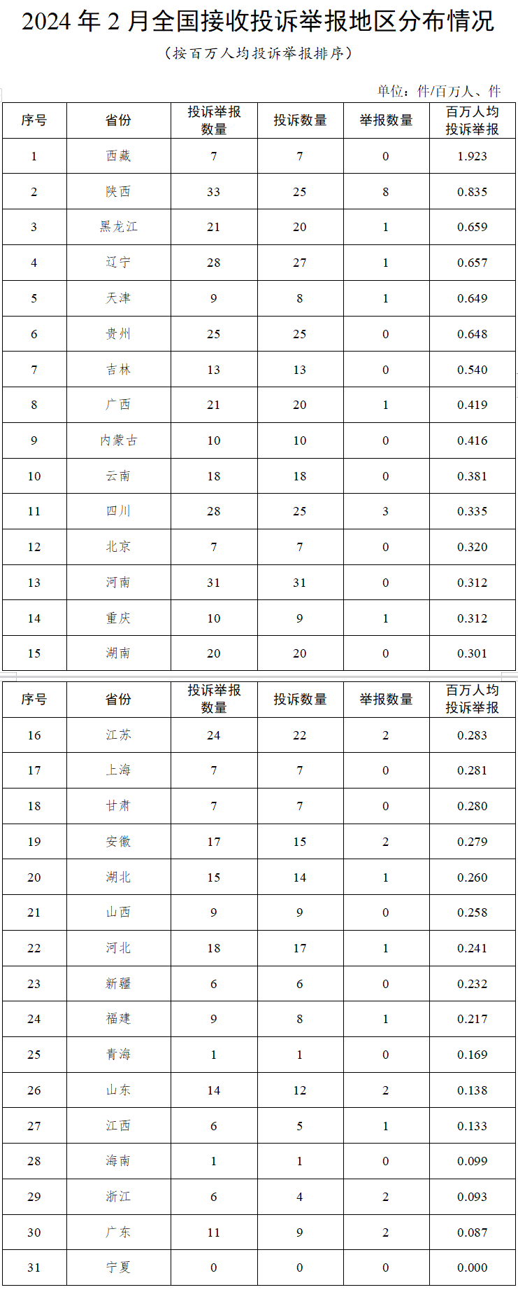 各省(自治区、直辖市)按照接收投诉举报数量排序,陕西、河南、辽宁、四川、贵州排在全国前5位。按百万人均投诉举报数量排序,西藏、陕西、黑龙江、辽宁、天津排在全国前5位。(2024年2月全国接收投诉举报地区分布情况,见附件1)