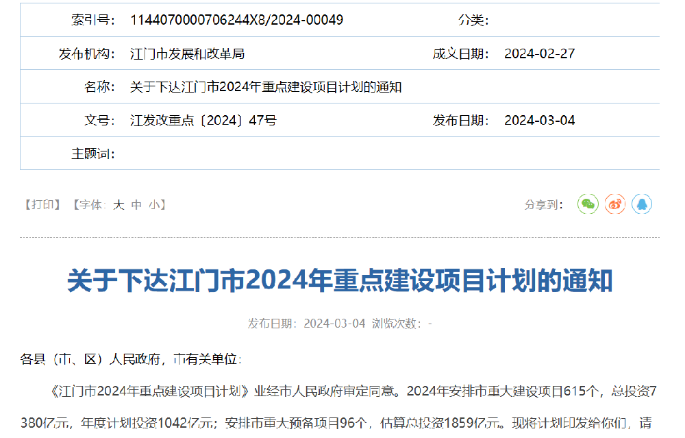 近日,广东省江门市发展和改革局发布《关于下达江门市2024年重点建设项目计划的通知》。