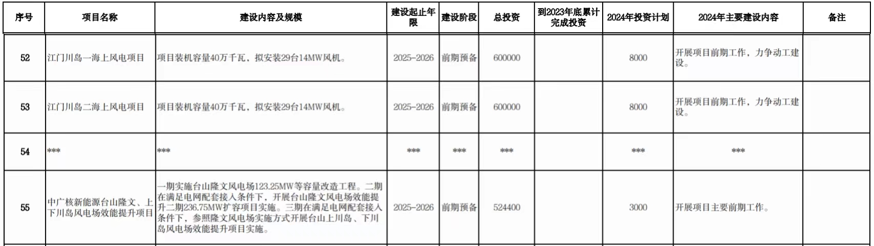 江门川岛一海上风电项目:位于江门市西南侧海域,装机容量40万千瓦,拟安装29台14MW风机。该项目由中广核风电有限公司负责开发,总投资600000万元,建设期为2025-2026年。