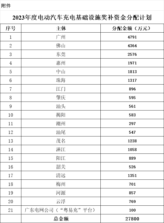 根据广东省政府确定的2021-2023年充(换)电基础设施奖补方案,今年计划安排2023年建成投运的充(换)电基础设施奖补资金2.78亿元。根据《广东省财政厅广东省能源局关于印发〈省能源局经管专项资金管理办法(2024年修订)〉的通知》(粤财工〔2024〕10号)有关规定,按照“锁定预算、总额控制”原则,我局根据各地市(不含深圳市)能源主管部门核查上报的建成投运、验收合格并于2023年取得“粤易充”平台接入证明的电动汽车充(换)电基础设施情况,采用因素法切块,编制了我省2023年度电动汽车充电基础设施奖补资金分配计划,涉及我省20个地市(不含深圳市)和“粤易充”平台,现将资金分配计划予以公示(见附件)。