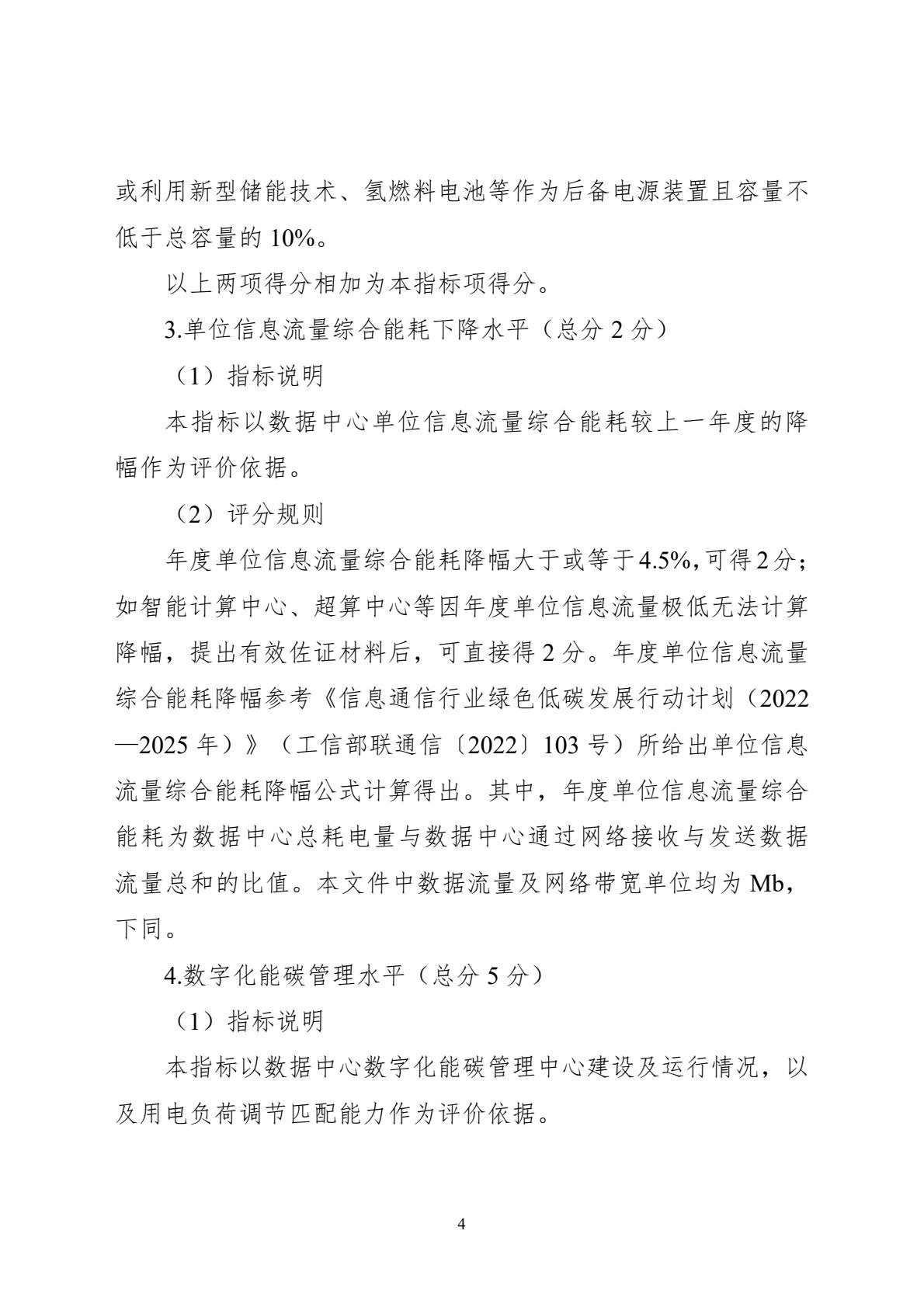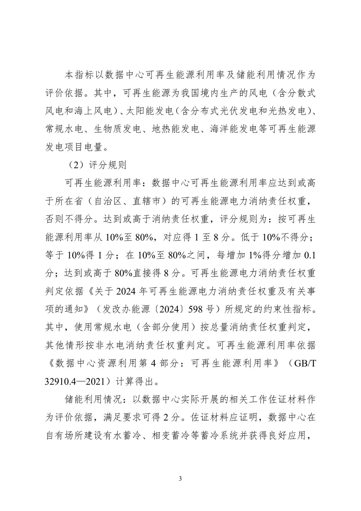 (四)数据中心原则上应达到《绿色数据中心评价》(GB/T 44989—2024)二级及以上等级。电能利用效率不高于1.30,达到《数据中心能效限定值及能效等级》(GB40879—2021)中的2级及以上水平。采用的服务器能效应达到《塔式和机架式服务器能效限定值及能效等级》(GB 43630—2023)等规定的节能水平及以上。风电、光伏等可再生能源利用率不低于数据中心所在省(区、市)可再生能源电力消纳责任权重,积极利用储能、氢能等技术,具有较强用电负荷调节匹配能力。