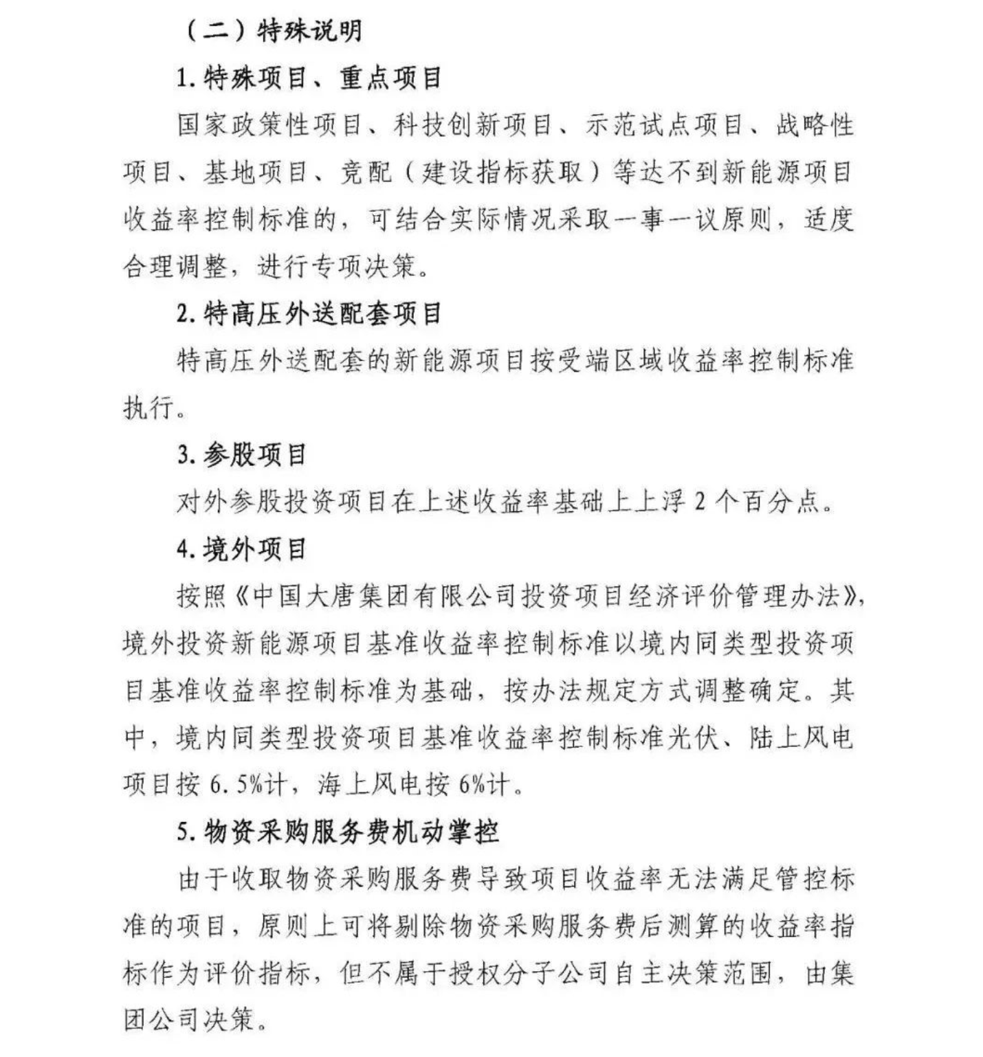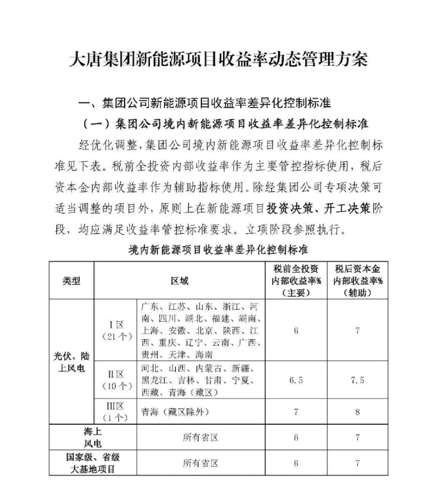 《方案》明确了大唐集团公司新能源项目收益率差异化控制标准,其中包括境内光伏、陆上风电、海上风电、国家级和省级大基地项目收益率差异化控制标准。