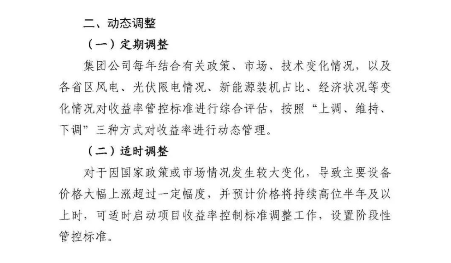 《方案》指出,税前全投资内部收益率作为主要管控指标使用,税后资本金内部收益率作为辅助指标使用。除经集团公司专项决策司适当调整的项目外,原则上在新能源项目投资决策、开工决策阶段,均应满足收益率管控标准要求。立项阶段参照执行。