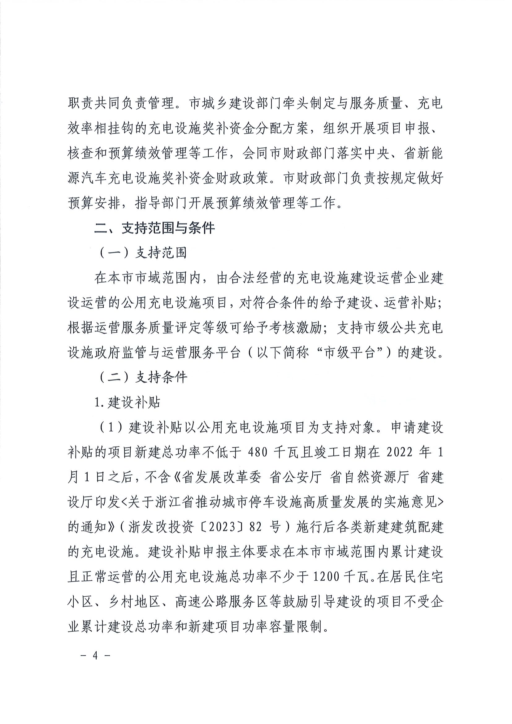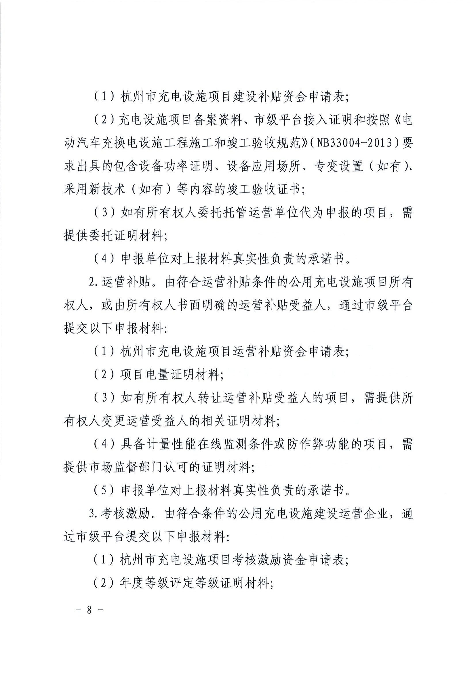 为进一步支持、引导我市新能源汽车公用充电设施高质量发展,根据《关于进一步构建高质量充电设施体系的指导意见》(国办发〔2023〕19号)、《财政部关于下达2022年节能减排补助资金预算的通知》(财建〔2022〕86号)、《浙江省财政厅关于提前下达2023年中央财政节能减排补助资金(新能源汽车充电基础设施建设奖励)预算的通知》(浙财建〔2022〕186号)、《浙江省财政厅关于提前下达2024年中央节能减排补助资金(新能源汽车领域)预算的通知》(浙财建〔2023〕148号)、《杭州市人民政府办公厅关于印发杭州市推进新能源电动汽车充电基础设施建设运营实施办法(修订)的通知》(杭政办函〔2023〕75号)和《杭州市新能源电动汽车公共充电设施奖励补贴资金分配实施细则》(杭建地空〔2023〕172号)等文件规定,现就做好2024年新能源汽车充电设施财政补贴申报工作通知如下: