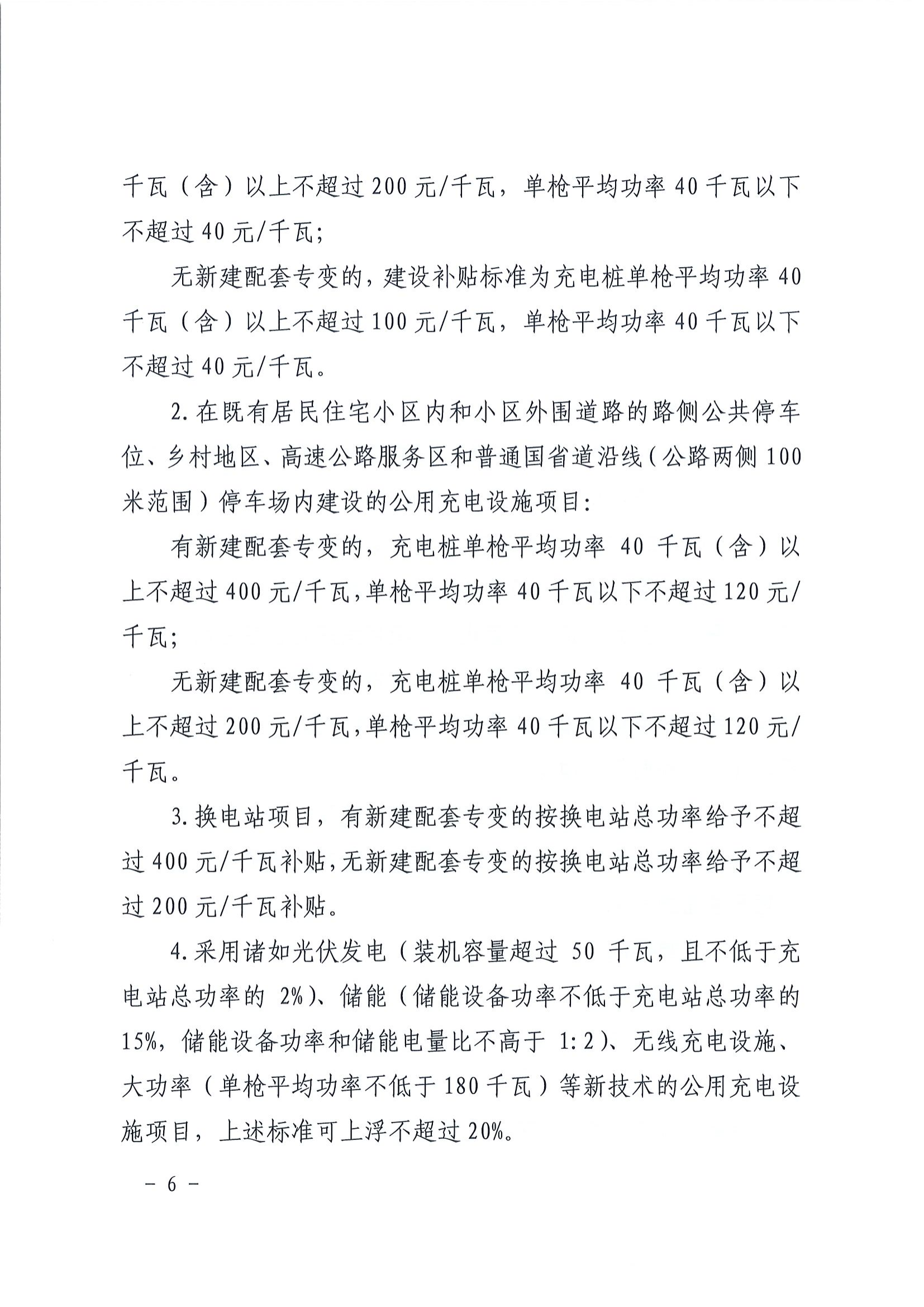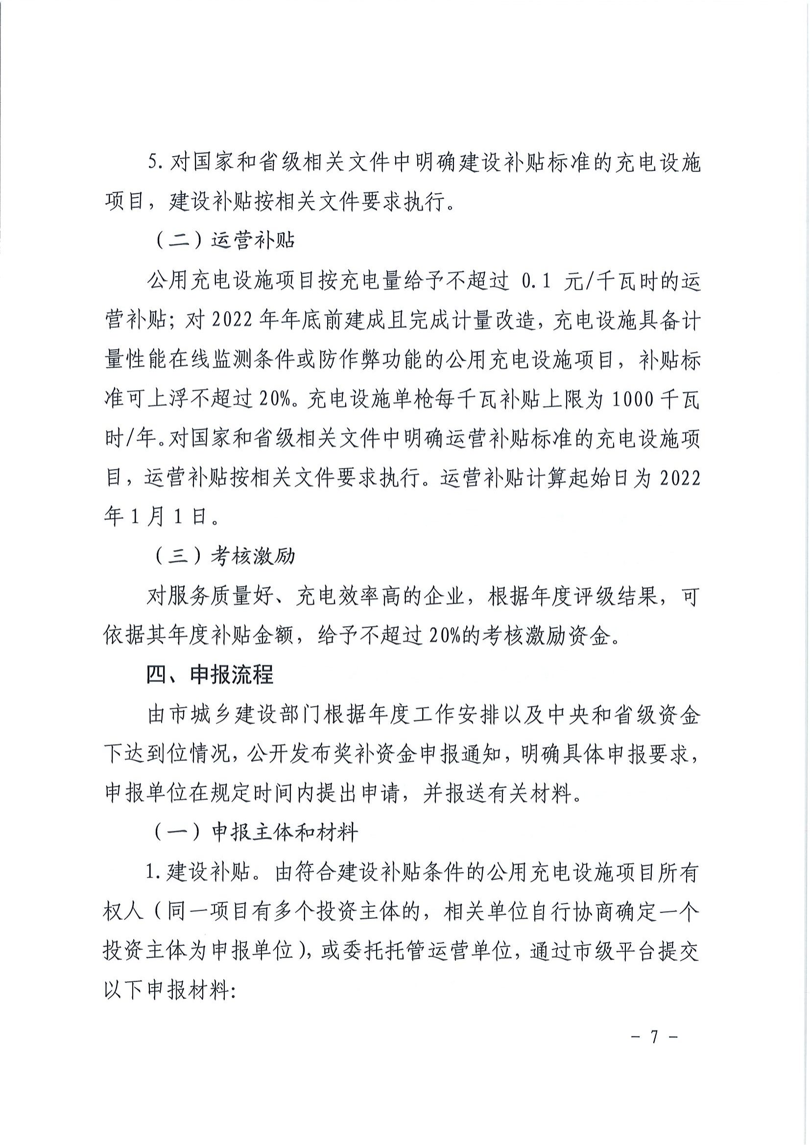 在建设补贴中,对含有储能设施,且功率不低于充电站总功率的15%,储能设备功率和储能电量比不高于1:2的充电项目给予建设补贴。在运营补贴中,公用充电设施项目按充电量给予不超过0.1元/千瓦时的运营补贴;对2022年年底前建成且完成计量改造,充电设施具备计量性能在线监测条件或防作弊功能的公用充电设施项目,补贴标准可上浮不超过20%。充电设施单枪每千瓦补贴上限为1000千瓦时/年。对国家和省级相关文件中明确运营补贴标准的充电设施项目,运营补贴按相关文件要求执行。运营补贴计算起始日为2022年1月1日。